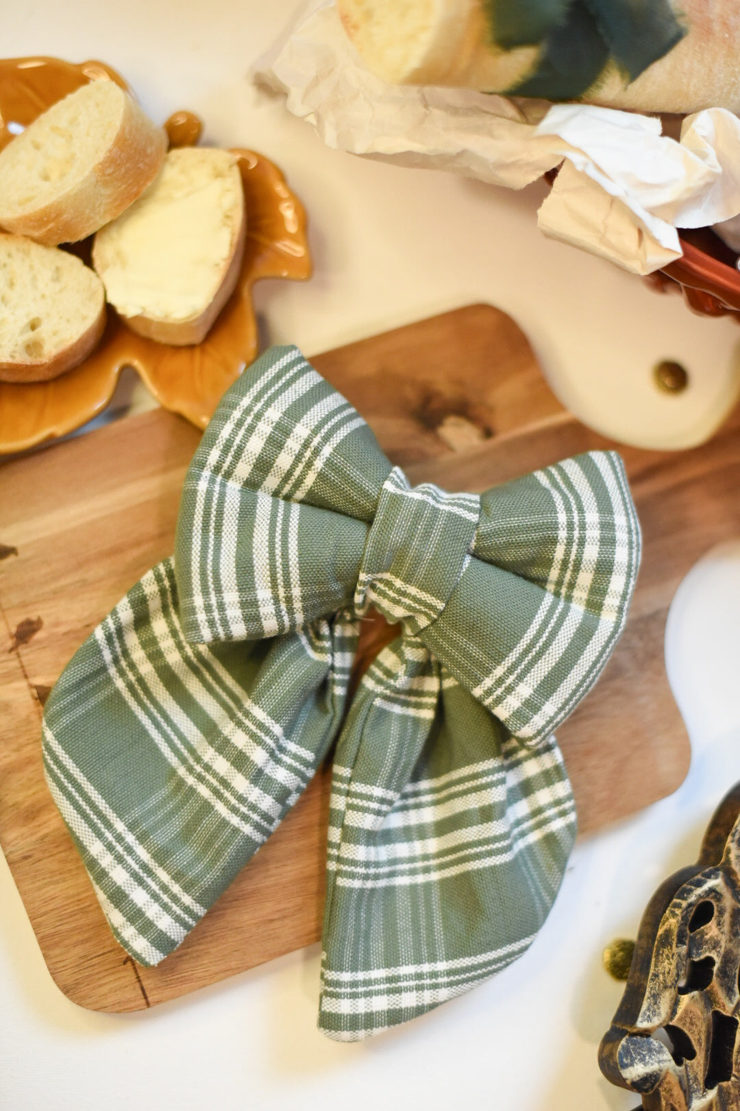 Large, Small, or Mini over the collar dog bow. Can fit any collar up to 2in. Has adjustable elastic sewed on the back. Comes in sailer or bow tie option.